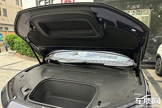 评测车的前备厢开启开关位置位于中控屏内部,由于采用电动支撑杆,操作起来毫不费力,并且前备厢同样配有感应功能,便利性表现值得称赞。