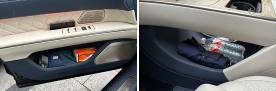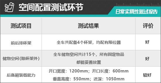 经过实测,评测车全车共计15个储物空间(不含杯架),上述固定物品均有合适的储物空间进行摆放,并且位置设计合理,拿取物品十分方便。