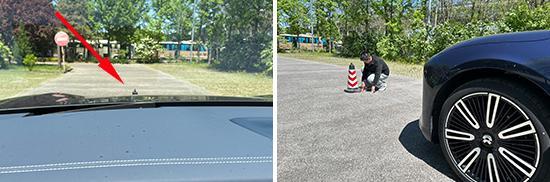 在测试前方视野环节,我们采用高70cm的桩桶作为参照物,随后调整车距,直至在主驾驶位可以看到桩桶上沿。经过测试,桩桶与车头最终测得的数据为2.455m,在测试过的同级别车型中处于中游水平。