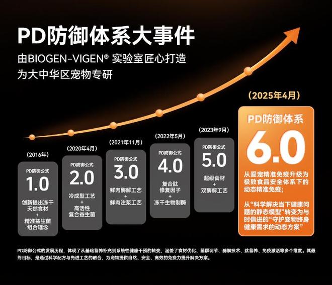 Pd防御体系6.0的进化过程,绝非是简单的数字更迭,而是一场深耕于免疫进阶的革命。我们以原生性免疫焕活、获得性免疫强化、核心免疫进阶3步曲精密调控,突破基础营养,引领宠物迈入免疫自主时代。
