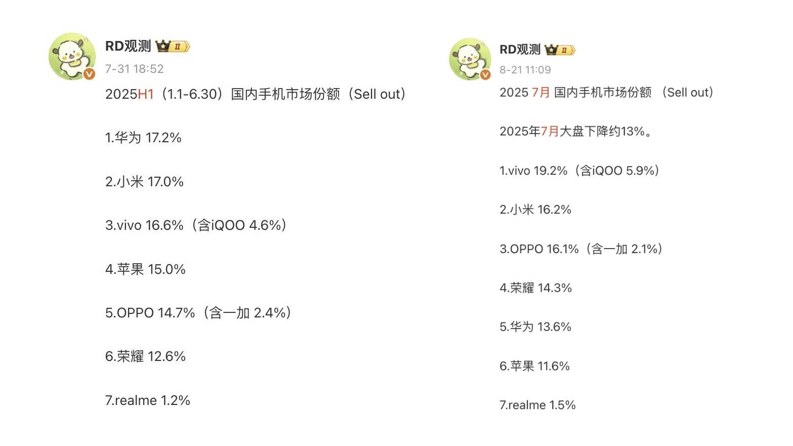 排名第四的是OPPO,它的市场份额为15.7%,其中一加的市场份额是2.4%。在2025年H1榜单中,OPPO以14.7%的市场份额排名第五,在7月份榜单中以16.1%的市场份额排名第三,所以第三季度的OPPO手机销量在大幅提升。在8月份的周榜中,OPPO多次打败小米排名第二,W35被小米反超的原因是红米Note15系列开售。