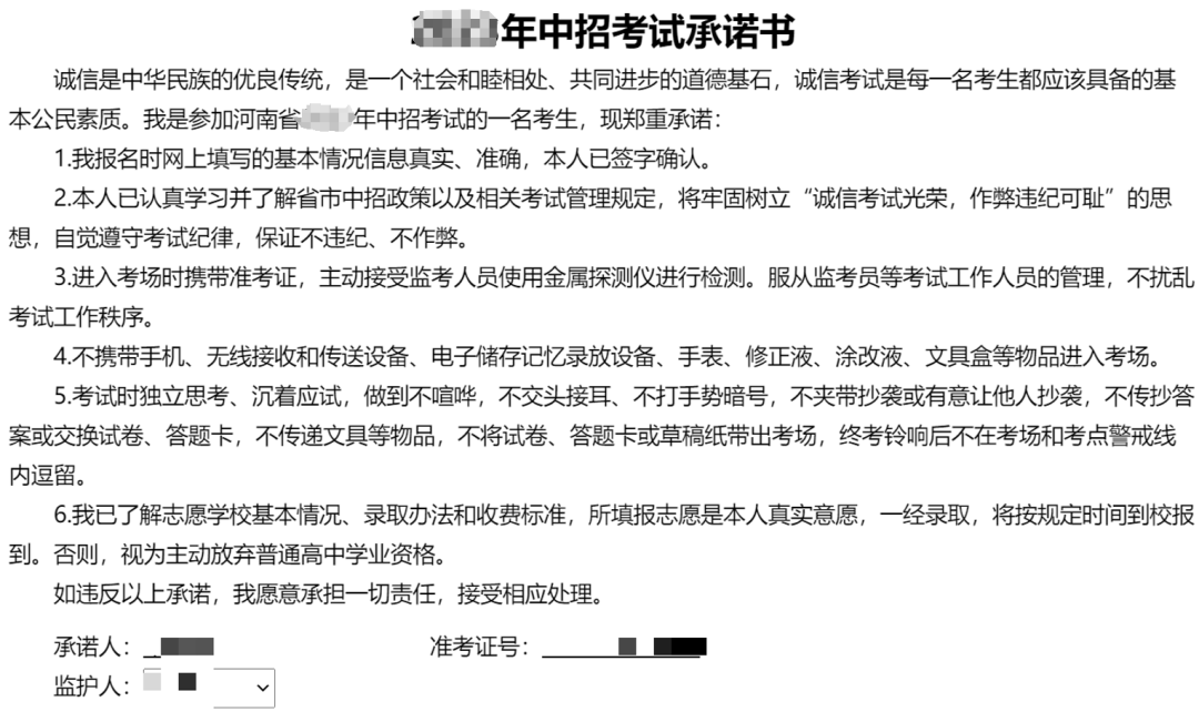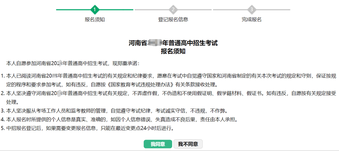 请考生认真阅读承诺书,如接受承诺书条款,点击“我同意”进入下一步。否则点击“我不同意”放弃本次中考报名。