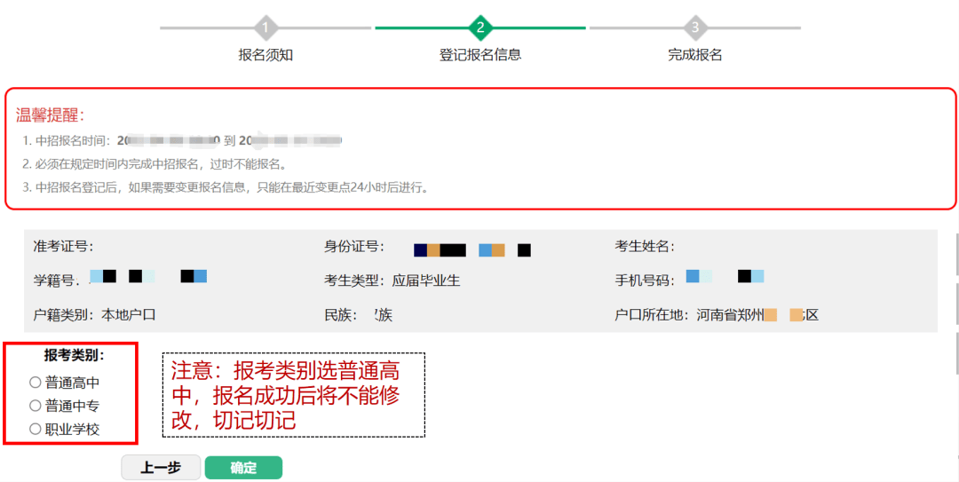 报考类别:分为“普通高中、普通中专、职业学校”三种,请考生务必正确选择自己的报考类别,在报名成功后将不能再修改。