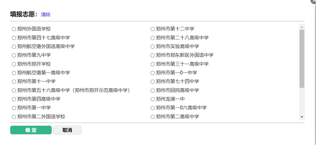 填报志愿时,考生点击选择框的倒三角按钮,弹出志愿学校列表框(如下图所示),考生可在列表框中选择要报考的学校(即点击学校名称前的圆点即可)。